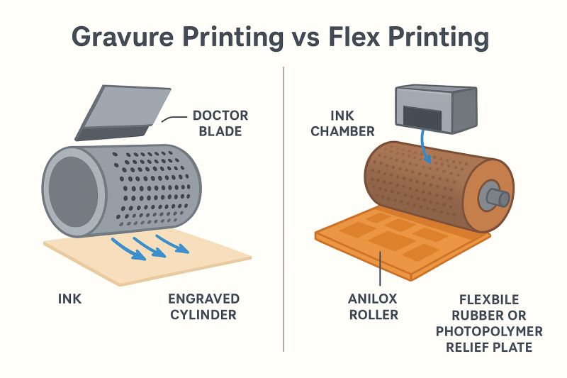 گراور: مناسب برای چاپهای باکیفیت و در تیراژ بالا روی موادی مانند فیلمهای پلاستیکی، فویلهای فلزی و کاغذ.