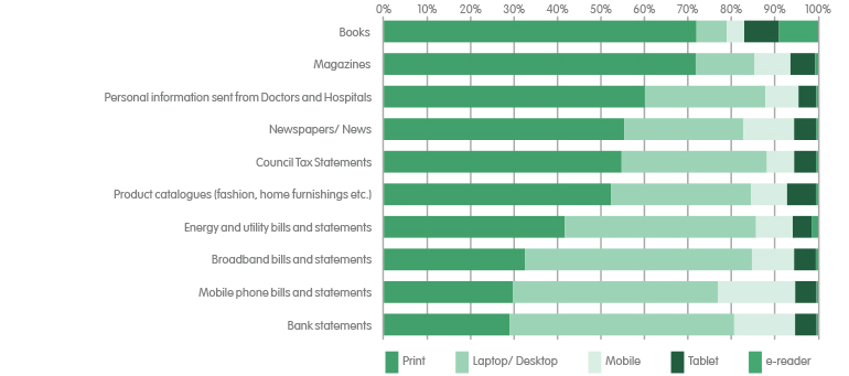 تحقیقاتی که ترجیحات خواندن برای انواع مختلف ارتباطات را بررسی میکند نشان میدهد که مصرفکنندگان ترجیح میدهند نسخه چاپی کتابها (72%)، مجلات (72%) و روزنامهها/اخبار (55%) را به گزینههای دیجیتال اولویت دهند. بسیاری از پاسخدهندگان همچنین بیان کردند که خواندن نسخه چاپی نسبت به خواندن الکترونیکی لذتبخشتر است. با این حال، ارتباطات از بانکها، شرکتهای انرژی، خدمات عمومی و ارایهدهندگان مخابرات بهطور متوسط فقط 33% ترجیح به نسخه چاپی دارند.
