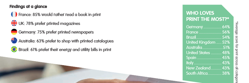 این گزارش پاسخهای تمامی ده کشور را تحلیل کرده و بینش منحصربهفردی از اولویت ها، نگرشها و اعتماد مصرفکنندگان به چاپ و کاغذ در دنیای دیجیتال ارایه میدهد. بهطور کلی، نتایج نشان میدهند که مصرفکنندگان به اطلاعات خوانده شده در محصولات چاپی اعتماد دارند، از آن لذت میبرند و درک عمیقتری از آن دارند همزمان با نشانههایی از خستگی دیجیتال و نگرانی در مورد امنیت و حریم خصوصی.