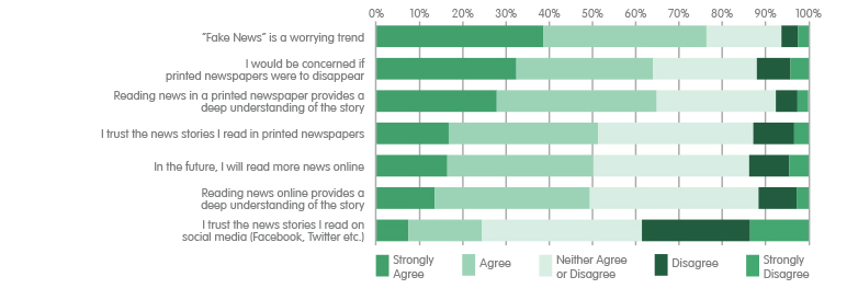 بیشتر مصرفکنندگان معتقدند که هنگام خواندن از رسانههای چاپی (65%) نسبت به منابع خبری آنلاین (49%) درک عمیقتری از داستان به دست میآورند. علاوه بر این، مصرفکنندگان به داستانهای خوانده شده در روزنامههای چاپی (51%) بیشتر از داستانهای موجود در رسانههای اجتماعی (24%) اعتماد دارند. همچنین اکثریت مصرفکنندگان (76%) بیان کردند که نگران روند “اخبار جعلی” هستند.