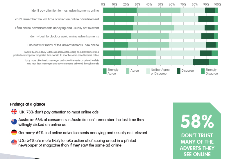 نتایج نشان میدهد که بسیاری از مصرفکنندگان به تبلیغات آنلاین توجه نمیکنند (68%) و 57% تمام تلاش خود را برای اجتناب از آنها انجام میدهند. اکثریت (60%) موافق هستند که نمیتوانند به یاد بیاورند آخرین باری که به صورت داوطلبانه بر روی یک تبلیغ آنلاین کلیک کردهاند چه زمانی بوده است.