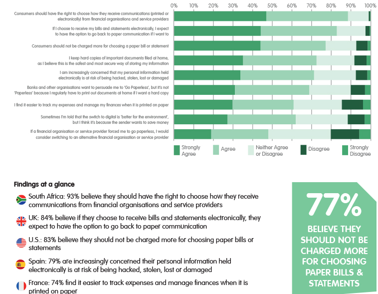 - بسیاری از ارایهدهندگان خدمات هزینههایی را برای دریافت ارتباطات کاغذی از مشتریان خود دریافت میکنند، اما 77% از پاسخدهندگان جهانی معتقدند که نباید برای انتخاب صورتحسابها و بیانیههای کاغذی هزینه بیشتری پرداخت کنند. در ایالات متحده، 83% از مصرفکنندگان معتقدند که این خدمات ضروری نباید هزینه اضافی برای آنها داشته باشد.