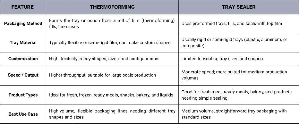 هر دو ماشين ترموفرمينگ و تری سيلر برای سيل كردن محصولات غذايی در تری ها تحت شرايط وكيوم يا اتمسفر اصلاح شده (MAP) استفاده می شوند. اين ماشين ها معمولا در بسته بندی غذاهای آماده، گوشت، مرغ، غذاهای دريايی، لبنيات و اسنك ها كاربرد دارند؛ جايی كه افزايش ماندگاری، حفاظت از محصول و نمايش ظاهری جذاب اهميت بالايی دارد.