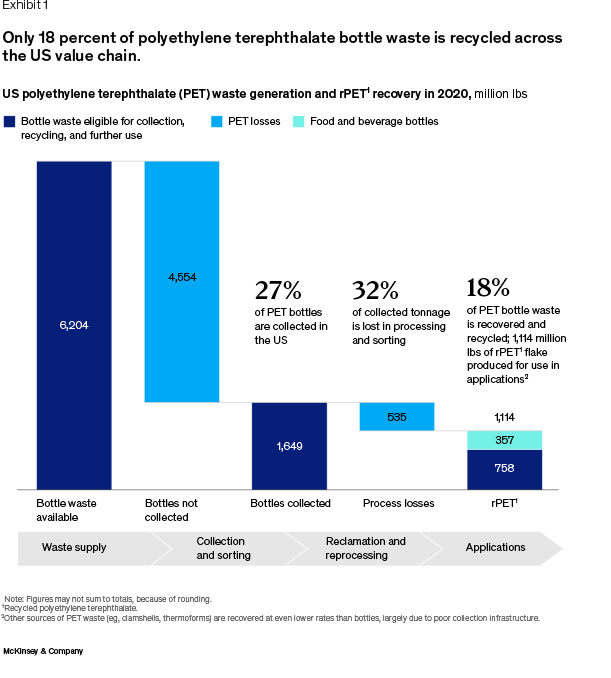 با توجه به اینکه بیش از ۸۰ درصد از زبالههای PET بلااستفاده باقی میمانند، فرصتهایی در سراسر زنجیره ارزش برای افزایش بازیابی PET، از جمعآوری تا مرتبسازی و پردازش وجود دارد. با توجه به اینکه برنامههای بازیافت اغلب در سطح محلی سازماندهی میشوند، فرصتهایی برای تشکیل مشارکتهای عمومی-خصوصی برای افزایش نرخ جمعآوری محلی در مناطقی با برنامههای بازیافت کنار خیابانی کمبودجه یا غیرموجود وجود دارد. به عنوان مثال، The Recycling Partnership سازمانی است که سرمایهگذاریهای خصوصی در برنامههای بازیافت عمومی انجام میدهد، با هدف افزایش عرضه پلاستیکهای بازیافتی. در عین حال، سرمایهگذاری در تجهیزات جداسازی پیشرفته در تاسیسات بازیابی مواد نیز راه دیگری برای افزایش عرضه rPET است. همچنین توجه داریم که در برخی کشورها (مانند کشورهای اسکاندیناوی)، سیاستهای ملی و ایالتی مانند مسوولیت گسترده تولیدکننده (EPR) یا طرحهای بازگشت سپرده، تأثیر قابل اندازهگیری بر عرضه rPET دارند.