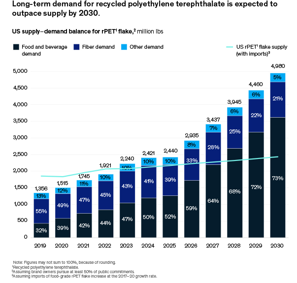 مالکان برندها به طور مداوم فرمتهای بستهبندی جدیدی را معرفی میکنند و راههای نوآورانهای برای افزایش قابلیت بازیافت محصولات و میزان محتوای بازیافتی ایجاد میکنند تا تعهدات بستهبندی پایدار خود را برآورده سازند، نگرانیهای مصرفکننده را برطرف کنند و خود را با فشارهای فزاینده نظارتی سازگار کنند. تقاضای بالای بلندمدت برای محتوای بازیافتی در بستهبندی میتواند منجر به کمبود مواد بستهبندی بازیافتی شود. با این حال، این شرکتها با خطر بسیار واقعی مواجه هستند که نتوانند به اهداف خود دست یابند زیرا کمبود پیشبینی شده مواد بازیافتی وجود دارد: میزان جمعآوری مواد بازیافتی باکیفیت تقریبا ثابت مانده است و این امر چالشهایی را برای مالکان برندها و شرکتهای بستهبندی ایجاد میکند. اگر برندهایی که تعهدات عمومی در مورد محتوای بازیافتی دارند، برنامههای خود را دنبال کنند، تقاضای ایالات متحده برای پلیاتیلن ترفتالات بازیافتی (rPET) در سال ۲۰۳۰ حدود سه برابر عرضه خواهد بود. در نتیجه، با افزایش عدم تعادل عرضه و تقاضا، ارزش افزوده بین rPET و PET بکر در دهه آینده میتواند به طور قابل توجهی افزایش یابد.در این مقاله سه راه برای افزایش دسترسی به rPET در بازار ایالات متحده را بررسی میکنیم.