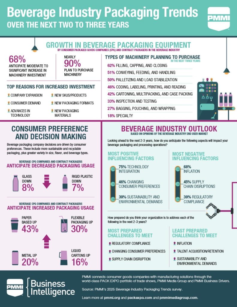 هنر بسته بندی / بین الملل: بررسی جدید PMMI از شرکتهای نوشیدنی نشان میدهد این صنعت تا سال ۲۰۲۸ با موجی از سرمایهگذاریهای سنگین در تجهیزات بستهبندی، تغییرات اساسی در مواد مصرفی، تحول دیجیتال و فشارهای جدید ناشی از ترجیحات مصرفکننده مواجه خواهد شد. نتایج نشان میدهد شرکتها ضمن تلاش برای افزایش ظرفیت، به سمت مواد پایدارتر، فرآیندهای خودکارتر و خطوط تولید انعطافپذیرتر حرکت میکنند، اما در عین حال با چالشهایی چون تورم، یکپارچهسازی فناوریها و بحران نیروی انسانی مواجهاند.