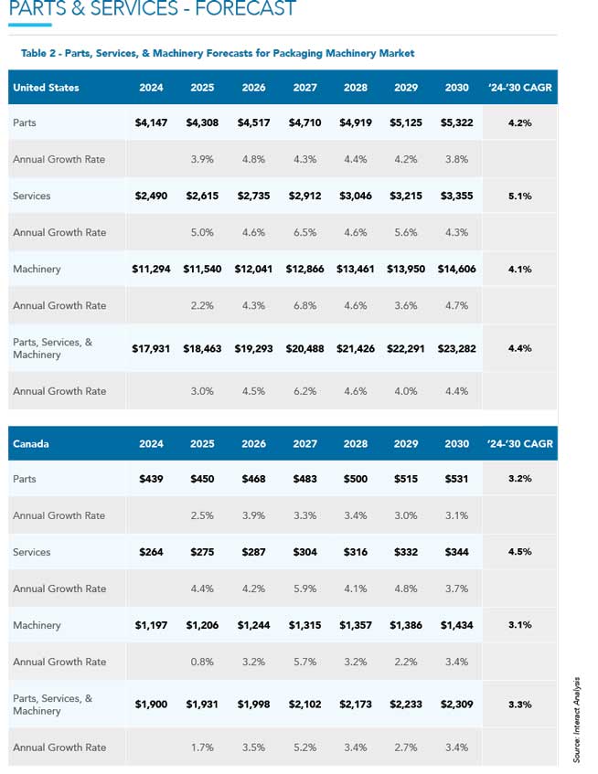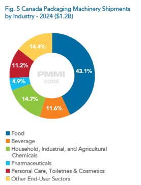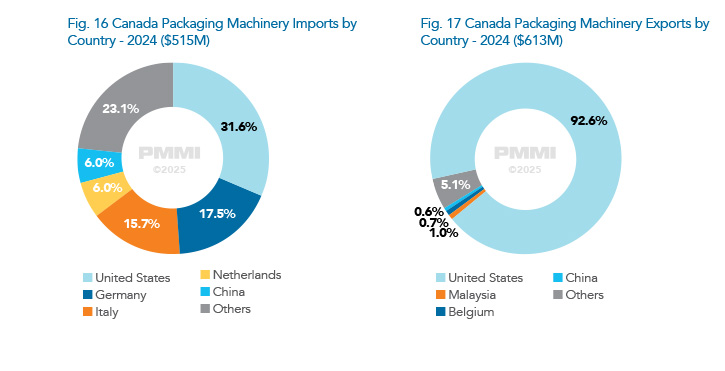 در سال 2024، ارزش فروش ماشین الات بسته بندی در کانادا به حدود 1.2 میلیارد دلار رسید و با وجود نرخ بهره بالا، رشد 3.1 درصدی را ثبت کرد. انتظار می رود بازار کانادا در سال 2025 تقریبا بدون رشد باقی بماند. در بلندمدت، ارزش بازار تا 2030 به 1.4 میلیارد دلار خواهد رسید که رشد آن عمدتا ناشی از اتوماسیون انتهای خط و فشار کمبود نیروی انسانی است.