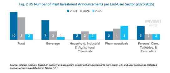 بخش غذا بزرگترین بخش بازار باقی مانده و در سال 2024 حدود 43.5 درصد از ارزش ماشین الات ارسال شده را به خود اختصاص داده است. سرمایه گذاری در این بخش نسبت به 2023 اندکی کاهش یافت، اما همچنان قابل توجه بود. شرکت هایی مانند Nestle و Campbell Soup Co مجموعا بیش از 575 میلیون دلار در شش تاسیسات سرمایه گذاری کردند که نشان دهنده تداوم توسعه، هرچند با سرعت کمتر، است.